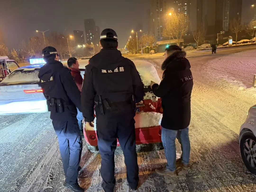 冰天雪地中,暖心的故事在不断发生。19日晚,巡警大队四中队巡逻组执勤至太行南路时,发现一名群众正冒雪艰难推行电动车。巡逻人员立即下车询问,得知他是来接自己的女儿放学,返家途中电动车电量耗尽,又遇道路结冰上坡,只能推车前行。民辅警们二话不说,合力将车推至平缓路段,并一路护送至其家门口附近。