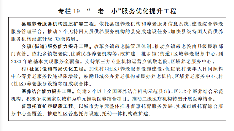 完善城乡养老服务网络。优化基本养老服务供给,推进区域养老服务中心建设,加快健全覆盖城乡的县乡村三级养老服务网络。有序推进养老机构分类改革,健全公办养老机构运营机制。大力发展社区嵌入式养老服务,以助餐、助浴、助洁、助行、助急和助医服务为重点,培育一批专业化、连锁化、品牌化运营的社区养老服务机构。积极发展农村互助性养老服务。发展家庭养老床位。建立养老从业人员培训机制,设立省、市、县三级养老服务人才培训基地,定期开展养老服务人员职业技能培训。推行长期护理保险,健全失能失智老年人照护体系。发展医养结合服务,扩大康复护理服务供给。提升养老服务综合监管质效。