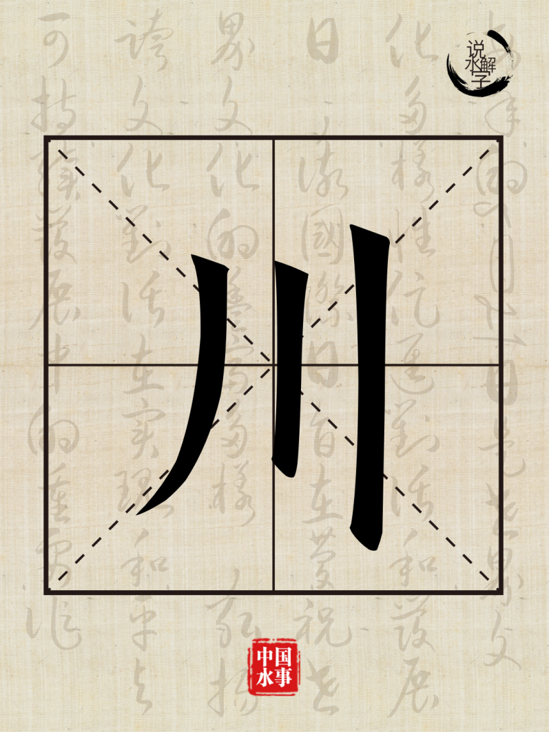“川”,属于典型的象形字,在甲骨文里由流水样的线条构成,本义是河流、水道,后又指山间或高原上平坦而地势低的平川。