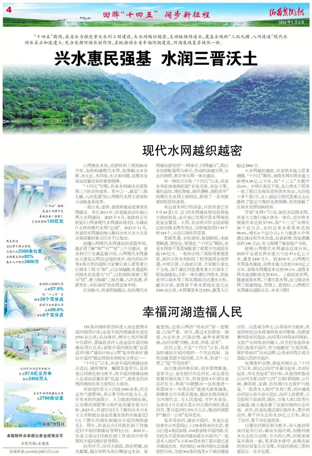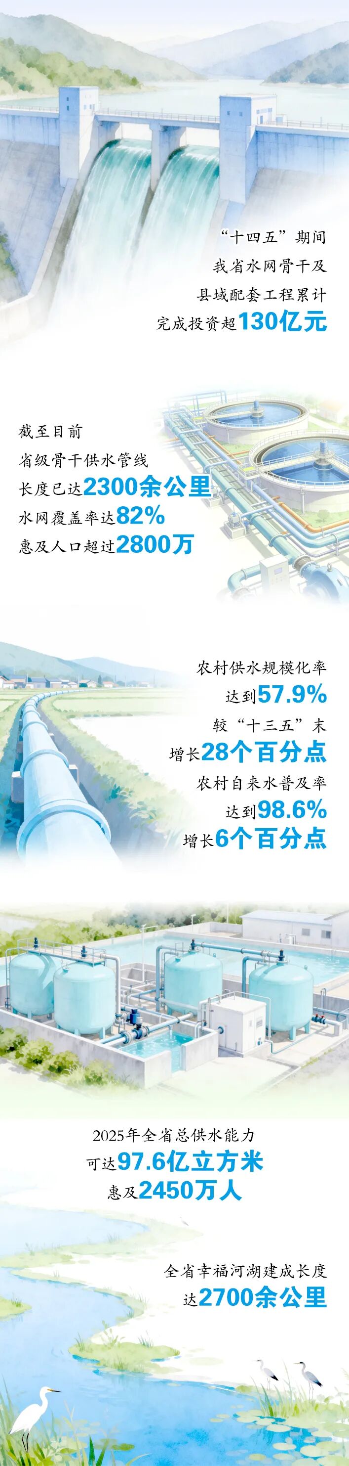 “十四五”期间,我省全力推进重大水利工程建设,大水网越织越密,主动脉陆续通水,覆盖全域的“三纵九横、八河连通”现代水网体系正加速建立;充分发挥河湖长制作用,系统推动全省幸福河湖建设,河湖泉域复苏焕然一新。