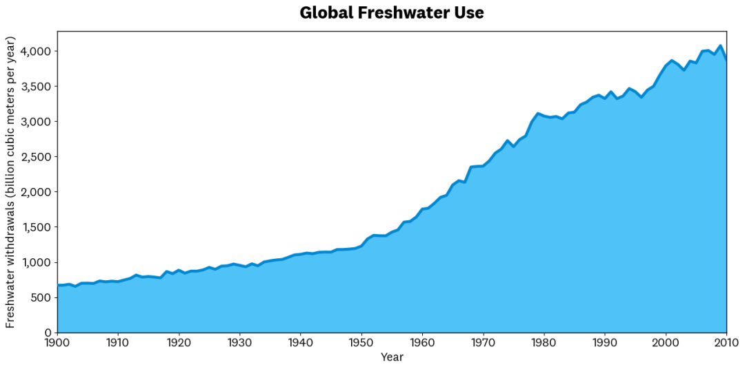 全球淡水使用量变化趋势图。该图显示1900至2010年间,全球农业、工业与生活淡水消耗量显著增长。用水量增加通常意味着生态用水占比下降,对自然资本造成重大且多为不可逆转的破坏。图片源自联合国大学水、环境与健康研究所