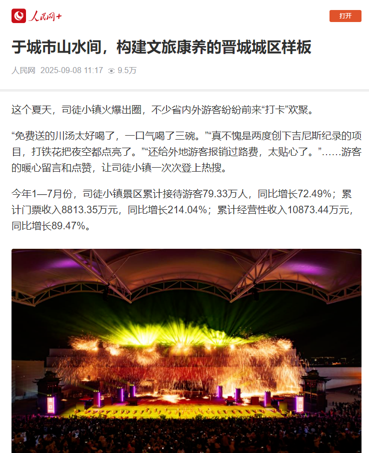 司徒旅游集聚区累计投资近10亿元建成司徒小镇,形成集“演艺、餐饮、游乐、民宿”于一体的产业链条。持续强化《千年铁魂》《只能这样》《又见老山西》3大剧目品牌打造,串联200余台实景演出,建设特色湖畔街区,带动小张村、前村、南石店等旅游乡村形成集聚效应。2024年,司徒小镇累计接待游客110万人次,营业性收入1.33亿元,居全市52家A级景区首位。