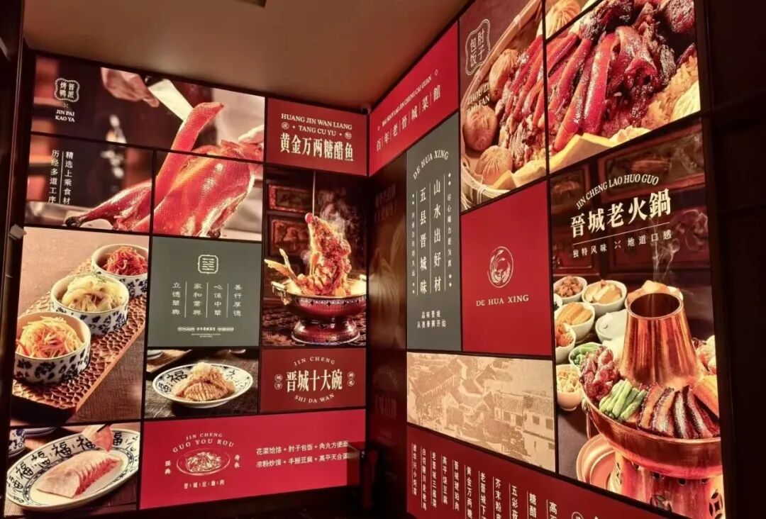 德华兴以文化为空间设计灵魂,1:1 复刻 88 块地方志记载的历史商号牌匾,打造整层非遗主题楼层,将晋城非遗技艺、民俗文化融入美陈与展陈,让用餐空间成为城市文化展示窗口,食客在品味美食的同时,沉浸式感受百年晋城的历史底蕴。