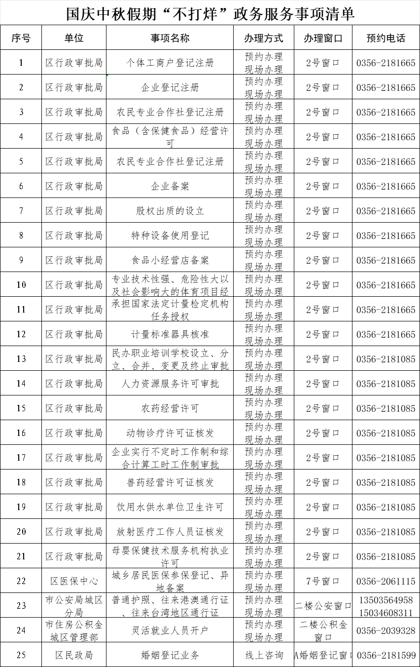 国庆中秋假期将至,为全力打造“晋心服务·城易办”政务服务品牌,最大限度满足市场主体和人民群众国庆中秋假期办事需求,晋城市城区政务服务中心决定在国庆中秋放假期间提供“不打烊”服务,现将有关事项公告如下: