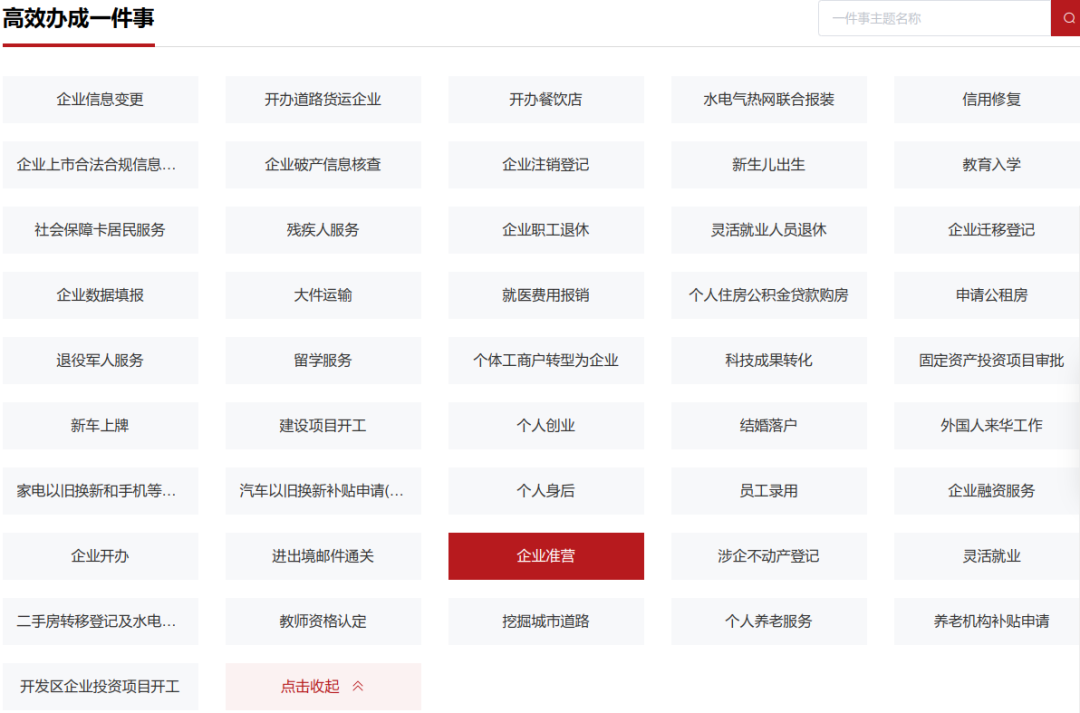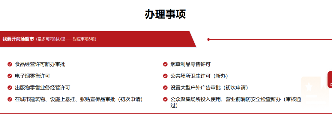 为破解企业开办环节多、流程繁、耗时长的痛点,政务服务部门创新推出“开办商场超市一件事一次办”服务,将食品经营许可新办审批、烟草制品零售许可、电子烟零售许可、公共场所卫生许可、出版物零售业务经营许可、设置大型户外广告审批、公众聚集场所投入使用、营业前消防安全检查新办以及在城市建筑物、设施上悬挂、张贴宣传品审批8项许可一次性办理,实现“一次告知、一表申请、一套材料、一窗受理、一网办理”。