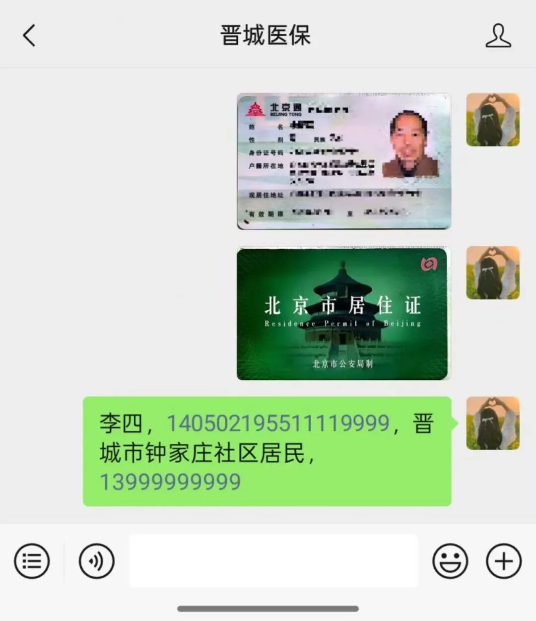 第二步:按照下方图片上的要求将居住证正反面、当地户口本首页加本人页或单位外派凭证以及个人信息发送到“晋城医保”微信公众号。