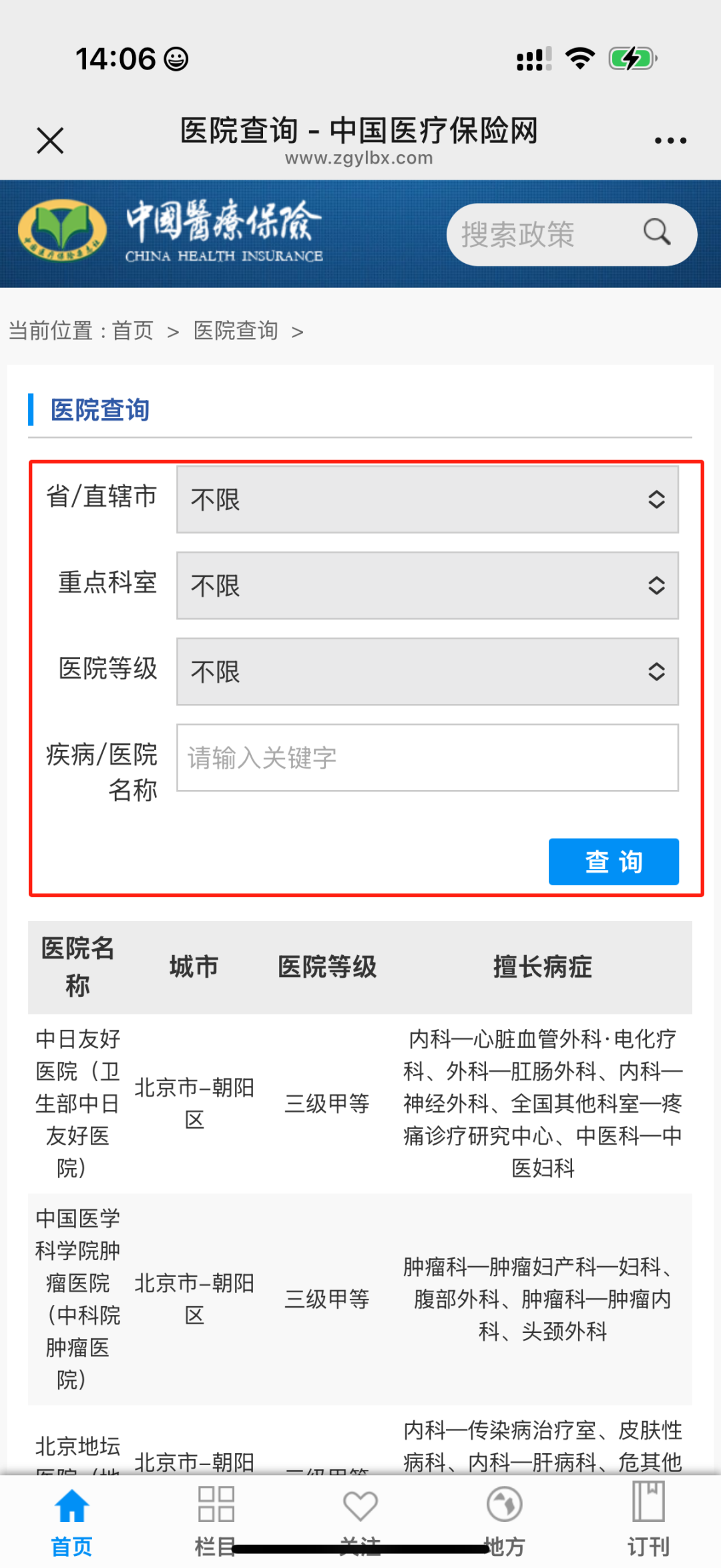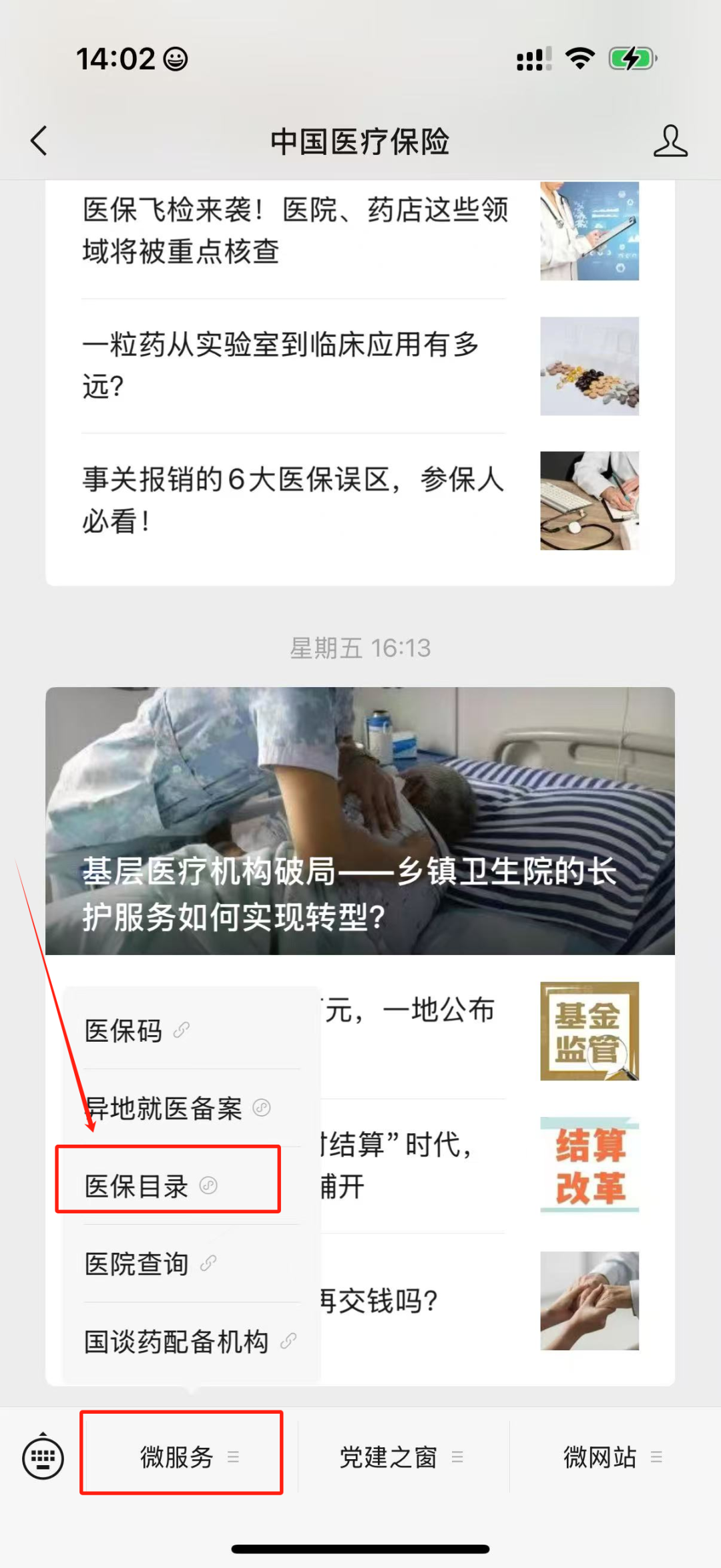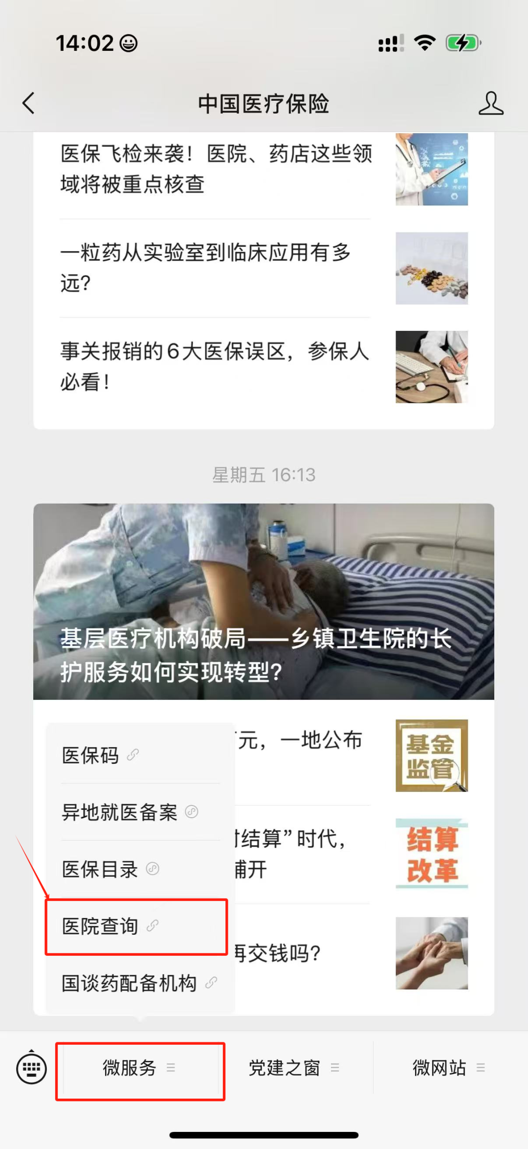 点击“中国医疗保险”公众号【微服务】选项,选择【医院查询】即可确定就医医院等级。