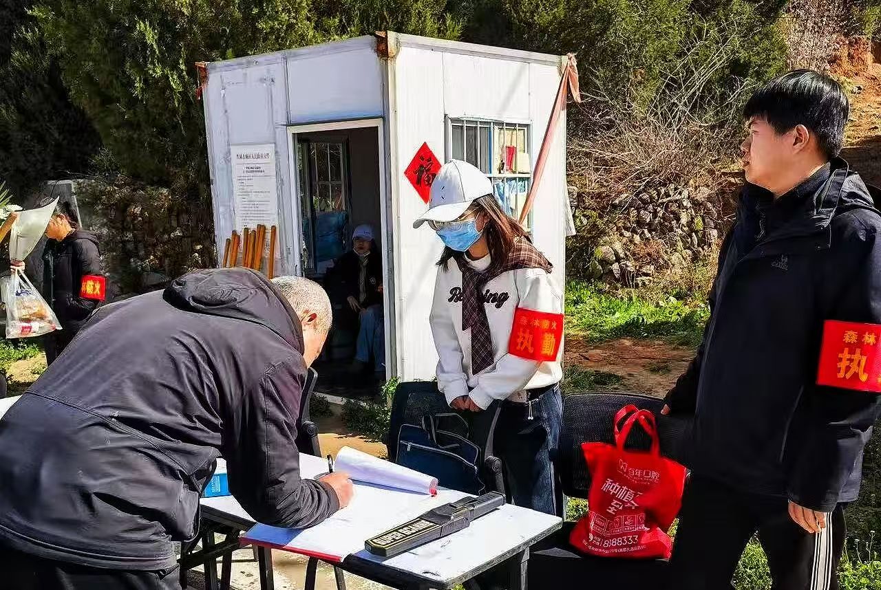 党旗插在一线:关键区域有党组织把守。在主要进山路口、山林腹地、墓地集中区等关键点位,一个个“党员先锋岗”醒目矗立,成为青山绿水间最亮眼的“红色坐标”。身着红马甲的党员干部、志愿者轮班值守、严阵以待,主动亮身份、作表率、当先锋。他们对每一辆进山车辆、每一位祭扫群众逐一排查,细致做好信息登记、火种收缴、政策宣讲等工作,以“严防死守、不漏一人一车”的硬核举措,坚决杜绝火种上山、火源入林。