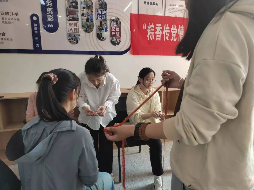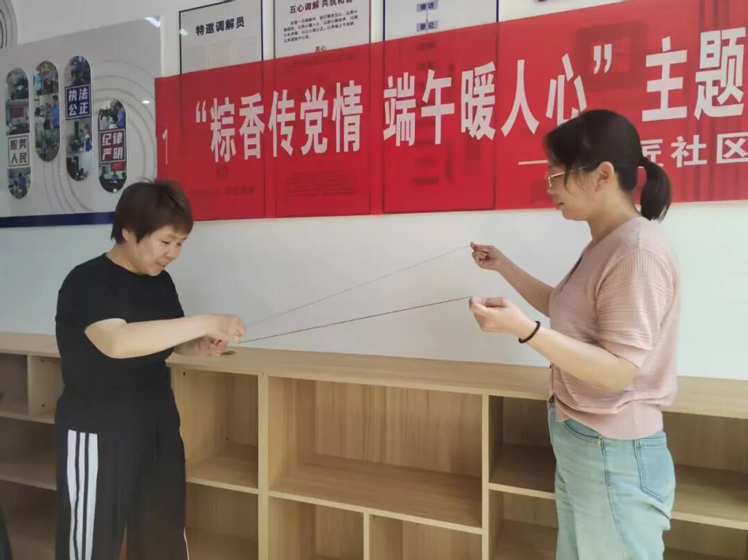 包粽子的欢声笑语还未消散,现场便自然转入下一个充满趣味的传统环节——编五彩绳。大家看着桌上早已备好的各色五彩丝线,目光中满是期待。有居民笑着说:“粽子是吃进肚里的端午,五彩绳可是戴在手上的福气呢!”在轻松的交谈中,手法熟练的阿姨们主动拿起丝线,一边演示如何将几股彩线编出紧实的纹路,一边分享着“五彩绳要在端午清晨系上,等下雨时剪下来扔进河里”的老习俗。新手们围在旁边,跟着捏住丝线两端,学做“十字结”“吉祥扣”,指尖缠绕间,彩线逐渐变成粗细均匀的绳结,有的还穿入小铃铛或玉石珠子,轻轻晃动便发出清脆声响。孩子们举着刚编好的五彩绳在活动室里跑来跑去,彩线在阳光下折射出斑斓光影,与桌上青绿的粽叶、雪白的糯米相映成趣,让传统节日的氛围感又添几分。