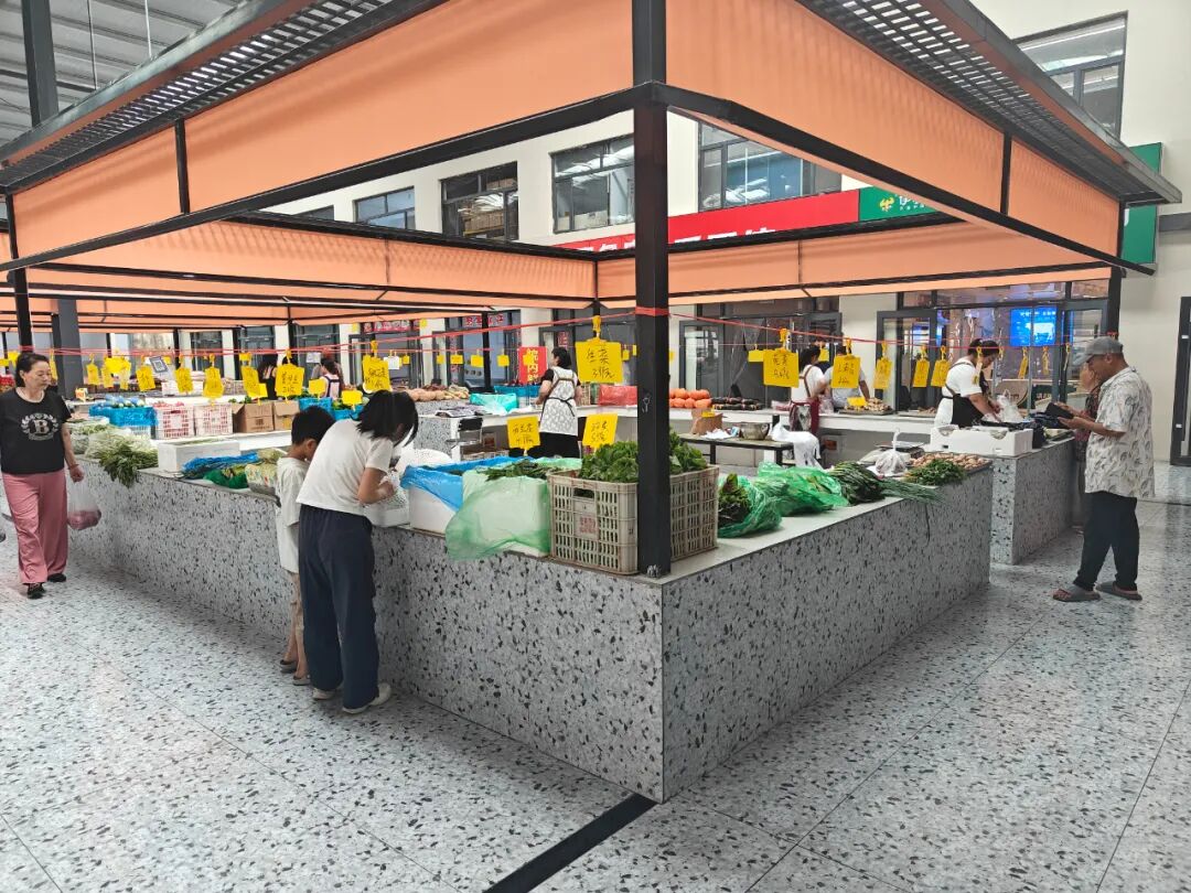 如今,3800平方米的便民市场已初步投入使用。几十个标准化摊位整齐排列,统一配备货架与台面,排水系统及照明设施完备,彻底扭转了以往流动摊贩无序经营的局面。市场内商品品类丰富,生鲜蔬果、肉类禽蛋等一应俱全,为居民构建起一站式购物体系。