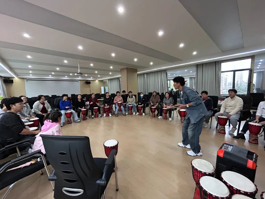 10月9日,非洲鼓课堂正式开课,老人们围坐一堂,在专业老师指导下,从最基础的“咚”、“哒”音节学起,认真专注的模样丝毫不逊于年轻学子。