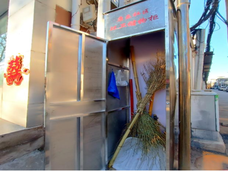 为解决这一实际困难,康乐社区迅速组织讨论、实地调研,最终决定在小区垃圾集中点附近安装一批立式环保储物柜。2025年12月底,首批环卫储物柜在康乐、康瑞两个小区率先试点启用。柜体采用防水不锈钢材质,坚固耐用,并配有专用钥匙,内部空间可容纳扫帚、铁锹等多种常用作业工具,解决了工具无处存放、容易丢失或损坏的困扰。